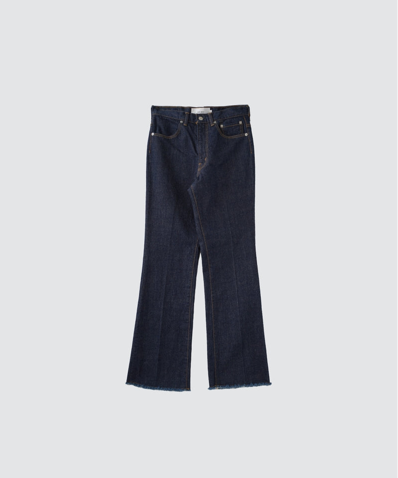 定番のクロップ丈ブーツカットシルエットです。ポケット口の盛り上がり、細身のベルトループは糸の太さを各パーツに使い分けて縫製しています。 ステッチ色はUJYO金茶色のコア糸を使用。 コインポケットは左側に配しています。 オリジナルタックボタン採用。 トルコ産オーガニックコットン100%使用しており、 経糸は、坂本デニムでインディゴ+硫化(色に深みを出す為)のロープ染色をしております。 よって中白になり経年劣化を味わう事が出来ます。