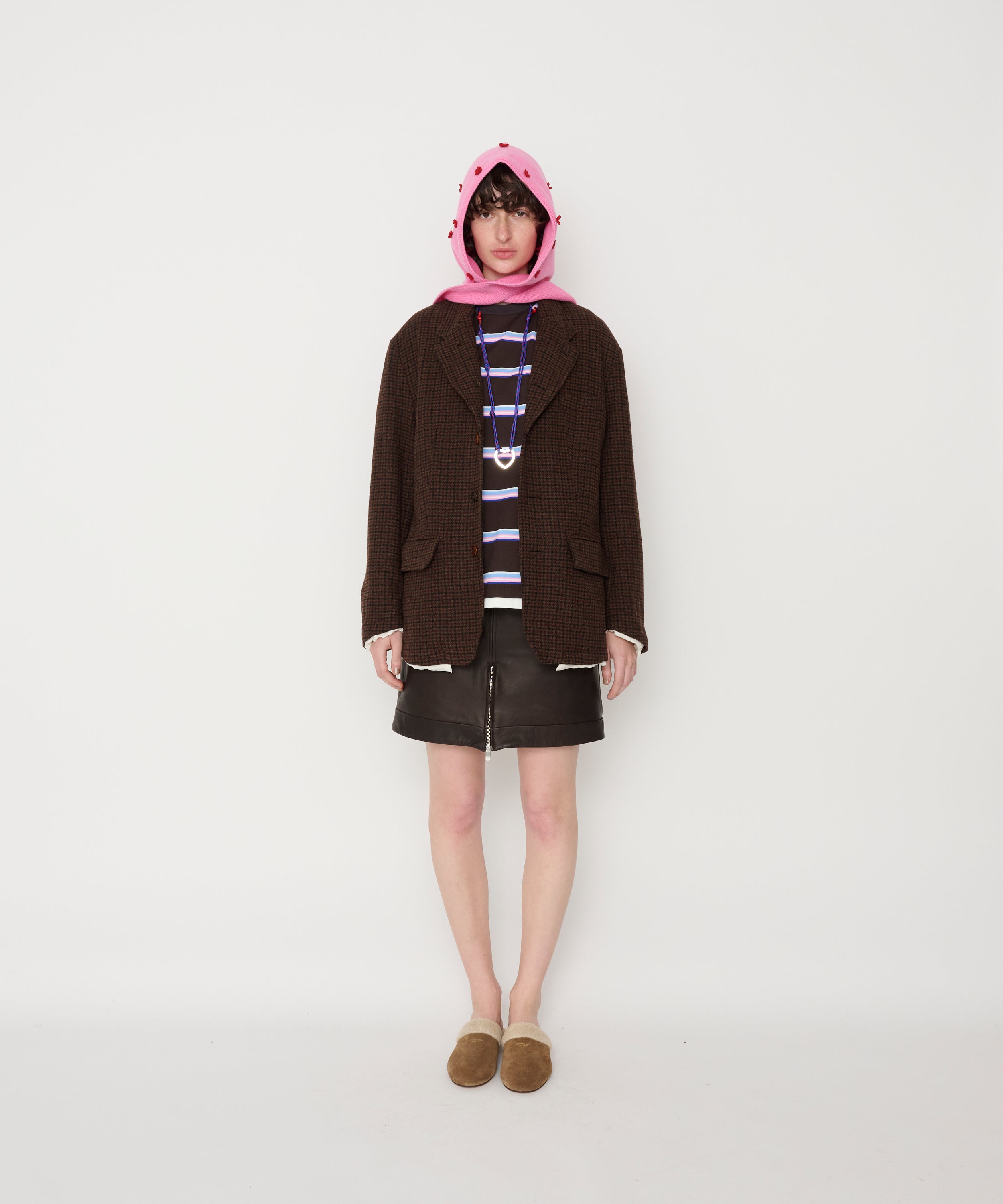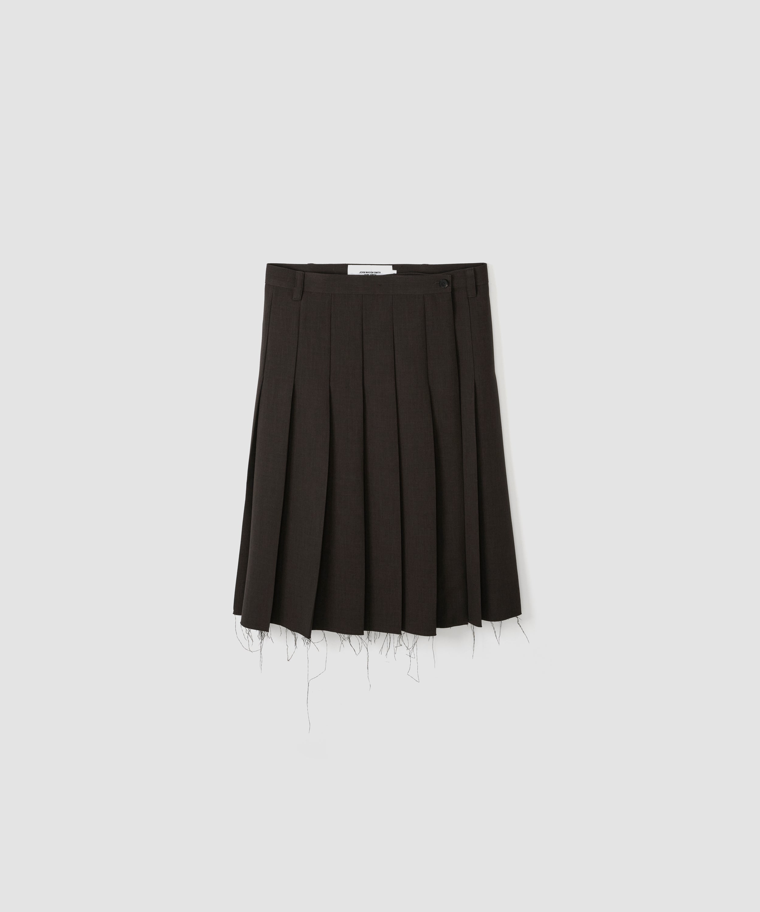 フレイドヘムニットプルオーバー。裾と袖口は切りっぱなしのフリンジのようにみせ、 襟ぐりは糸を出して解けたようにみせたデザインになります。ボディはウールを使用したスポンジッシュな紡毛糸。フレイドヘム部分は表面に輪状の糸(ループ)が出るよう加工された柔らかいタッチ感のある糸と、上品な光沢のあるレーヨンフィラメントのコードヤーンということなる質感の2種類をミックス。5G家庭機の天竺編みをベースにフレイドヘム部を別で作成し、組み合わせ、カッティングして仕上げています。ネック部分は、手編みの鈎針で作成した紐を2種類組み合わせて 手作業で付けています。洗いをかけて膨らみ感と、柔らさを出しています。